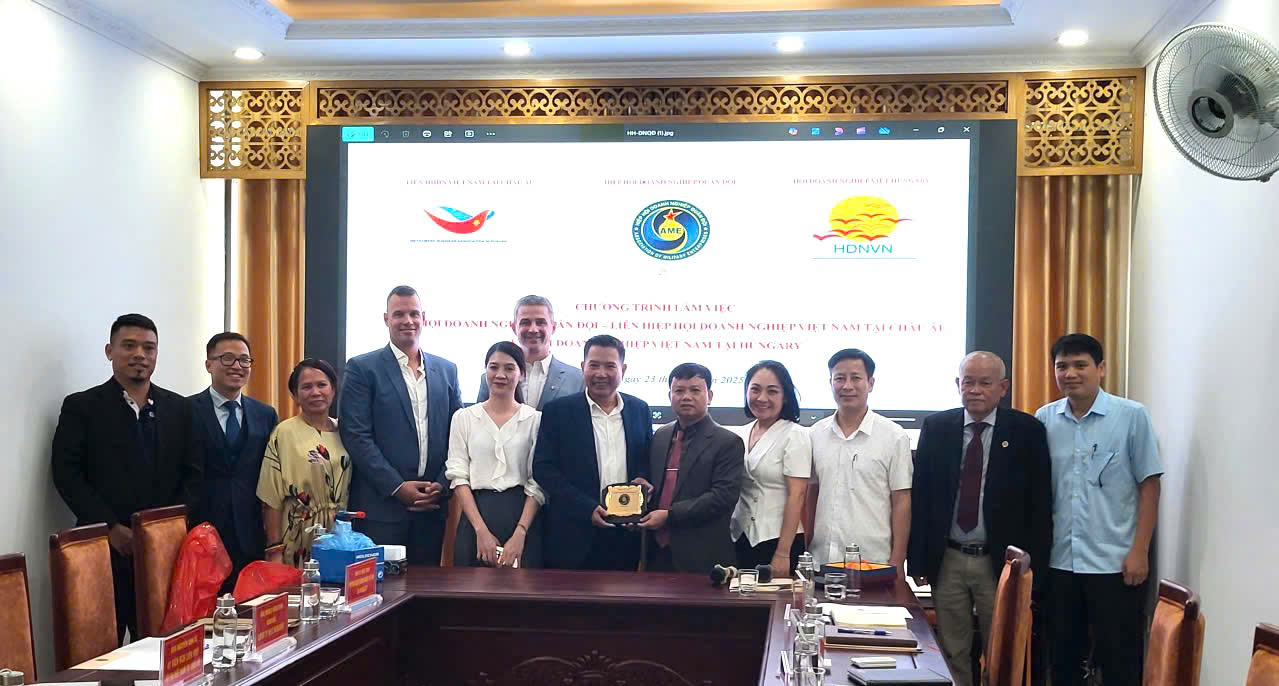 Sáng nay, ngày 23/9/2025 tại Hà Nội, Hiệp hội Doanh nghiệp quân đội đã làm việc với Hiệp hội doanh nhân Việt Nam tại Châu Âu và Hội doanh nghiệp Việt Nam tại Hungary về việc triển khai các hoạt động xúc tiến thương mại tại thị trường Châu Âu trong thời gian tới. Buổi làm việc còn có sự tham gia của một số doanh nghiệp là hội viên của Hiệp hội như: Công ty Hóa chất 21, Công ty ACC, Công ty TNHH MTV Cơ khí hóa chất 13.. Các bên trao đổi về các các ngành nghề, mặt hàng đa dạng, thiết thực, phục vụ đời sống dân sinh như: viễn thông, công nghệ thông tin, logistic, xây dựng, thi công, may mặc, da giày, sửa chữa tàu, cơ khí chính xác..., các doanh nghiệp Quân đội có nhiều ưu thế mở rộng chiếm lĩnh thị trường trong nước và xuất khẩu. Chính vì vậy, Hiệp hội doanh nghiệp Quân đội mong muốn thông qua Hiệp hội doanh nhân Việt Nam tại Châu Âu thúc đẩy nhiều hơn nữa các hoạt động xúc tiến thương mại tại thị trường Châu Âu, đặc biệt là Hungary. Đây cũng là dịp để các đại biểu chia sẻ về các công nghệ mới, hiện đại, tiên tiến nhất trên thế giới nhằm đổi mới phương thức sản xuất, xây dựng và phát triển bền vững. Các doanh nghiệp 2 bên đã trao đổi 1 số nội dung quan trọng như: Tái sự dụng rác thải trong sx, phương thức hỗ trợ giảm thiểu rủi ro, cháy nổ trong sản xuất.